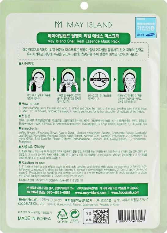 Регенеруюча тканинна маска з муцином равлика для шкіри обличчя May Island Snail Real Essence Mask Pack 25ml