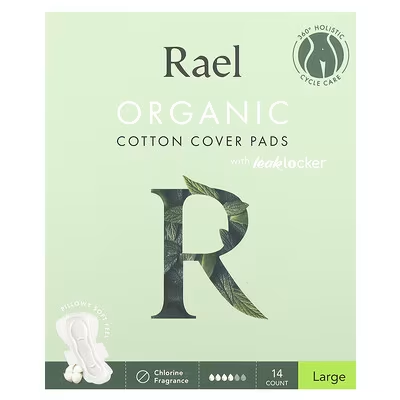 Жіночі гігєнічні прокладки без хлору та ароматизаторів з органічно вирощеної бавовни Rael Organic Cotton Cover Pads with Leak Locker Large 14 Count