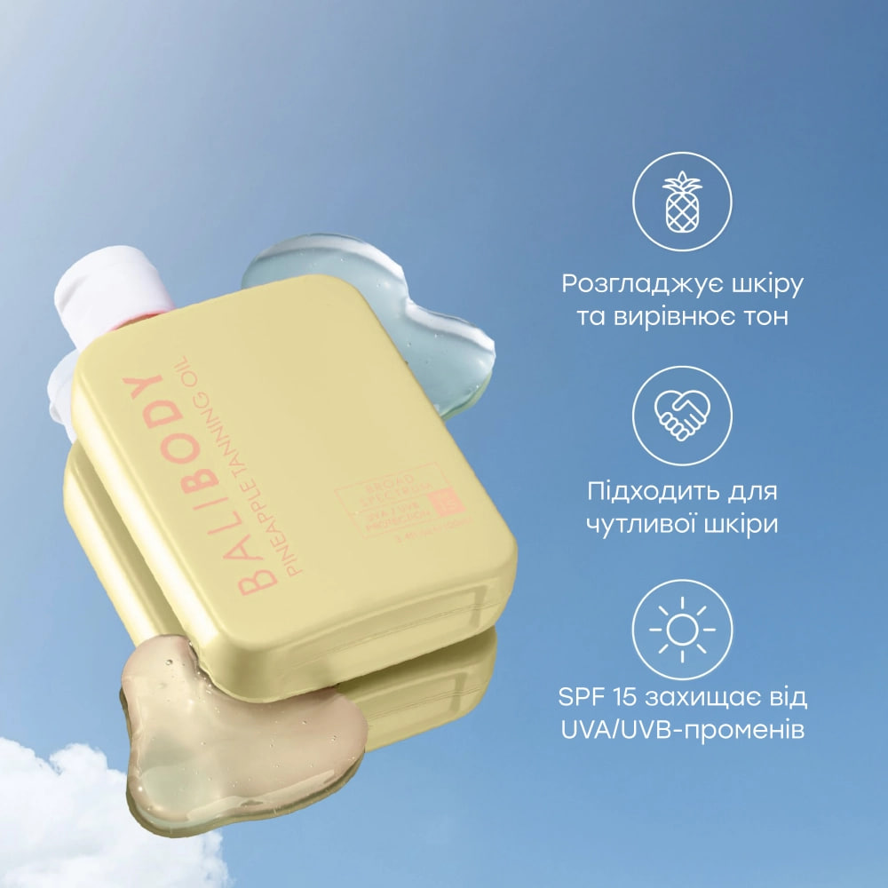 Олія для засмаги з екстрактом ананаса з фактором захисту від сонячних променів, з олією мигдалю, кокосу Bali Body Pineapple Tanning Oil SPF15 100ml